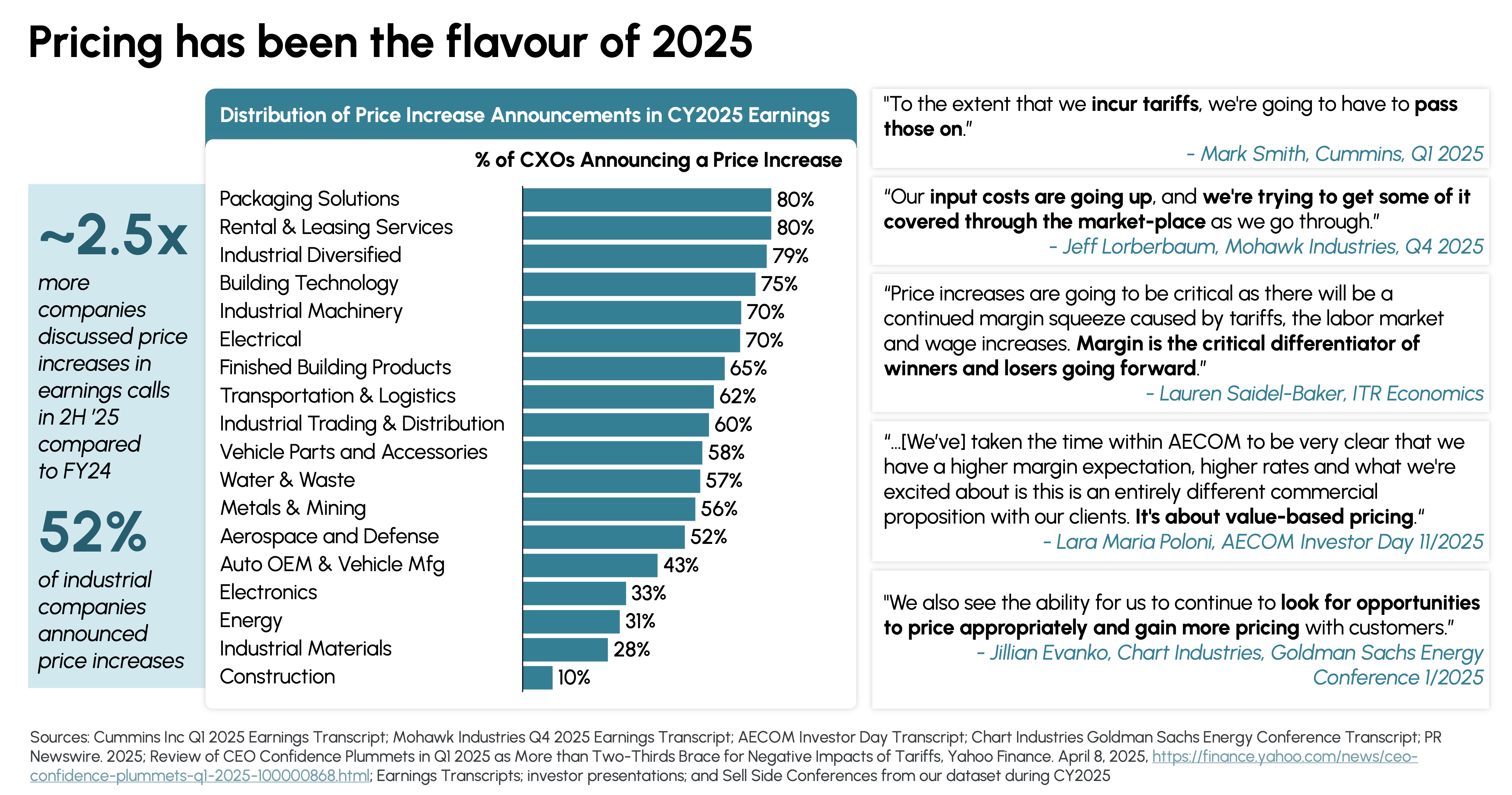 52% of industrial companies announced price increases in 2025, with earnings call discussions on pricing surging 2.5x in H2'25 vs. full-year 2024. Executives across segments were unequivocal on passing on costs as being non-negotiable (Exhibit 2).