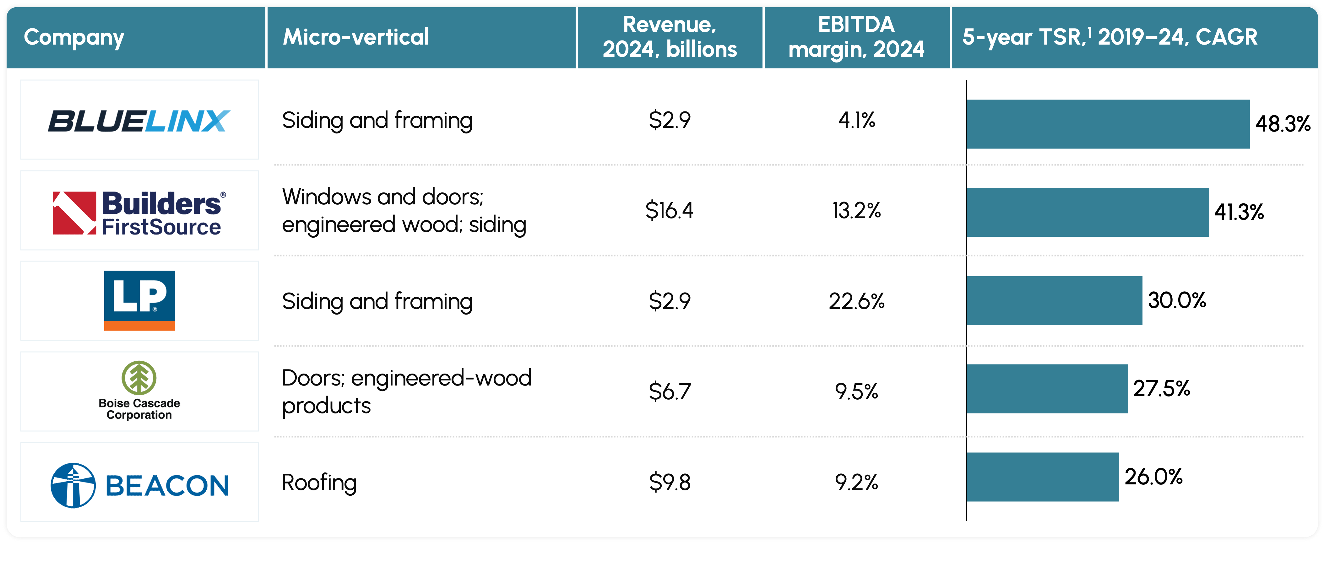 - Beacon, a distributor focused on roofing materials and complementary building products like siding, waterproofing, windows, and decking, rounds out the top five with revenue of $9.8 billion, margins of 9.2%, and five-year TSR of 26.0%. Beacon is scaling its physical and digital network, powered by solid operations and a strong product lineup. Providing an e-commerce option also enables growth.