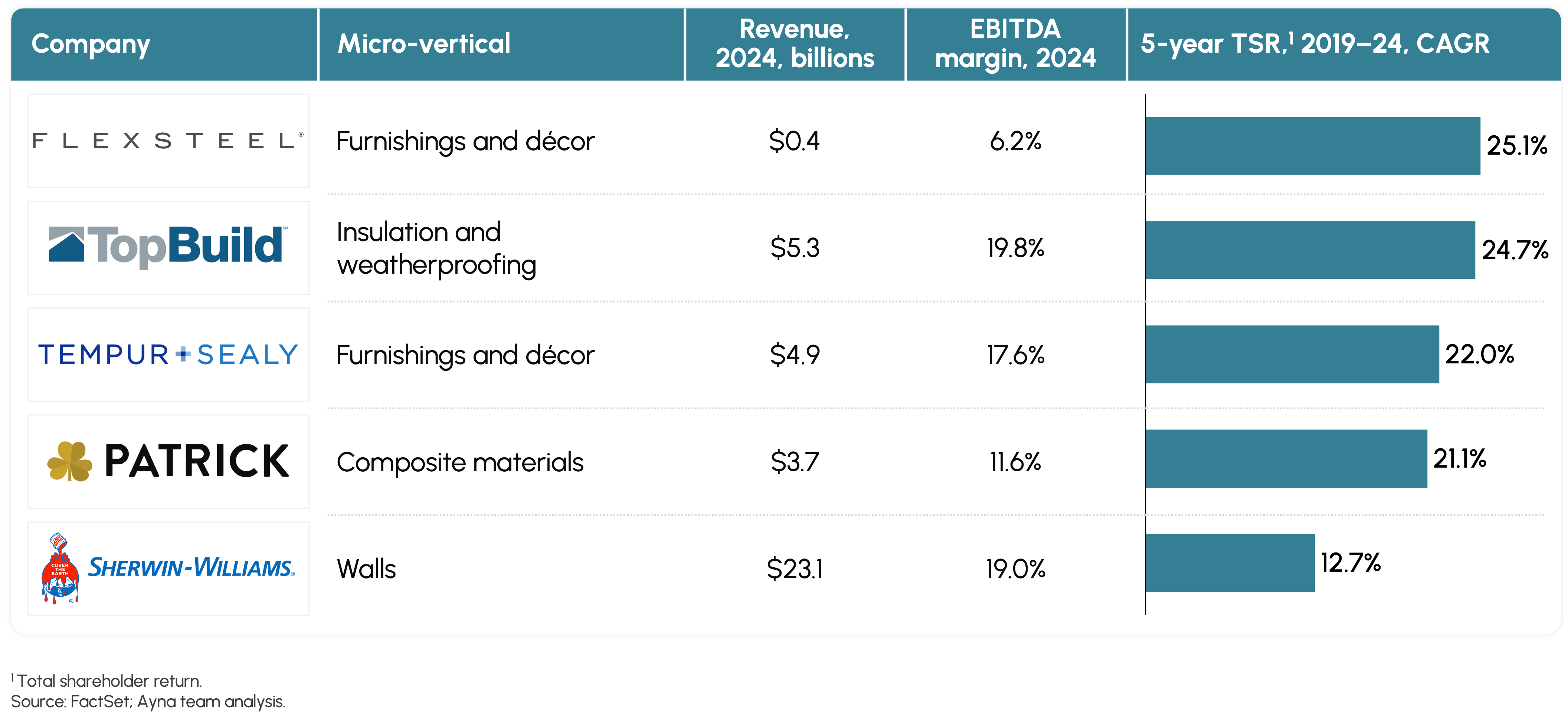 Overall, the companies providing building exterior products outperformed those in the interiors segment. Among the 16 publicly traded companies in building exteriors, the top five have 12% of the total market cap and expanded their five-year TSR by 35.6%. On a company-by-company basis, these five, with 2024 revenue between $2.9 billion and $16.4 billion, had impressive performance in TSR growth and EBITDA margins (see Exhibit 1):