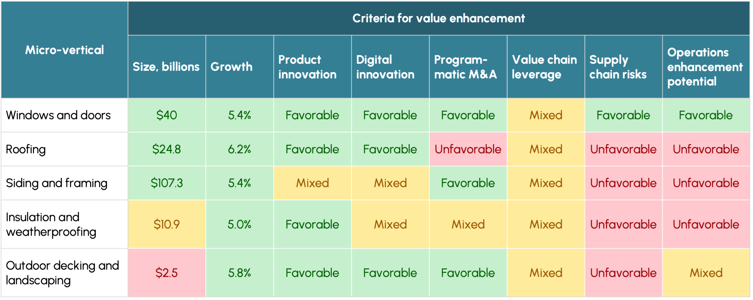 Within building exteriors, the windows and doors micro-vertical clearly stands out. The green squares in Table 2 indicate that this micro-vertical offers strong opportunities based on its size ($28.7 billion), growth rate (5.4%), and the other criteria except value chain leverage. The other micro-verticals present mixed or moderate opportunities (yellow) or low opportunities (red) for at least one other criterion.