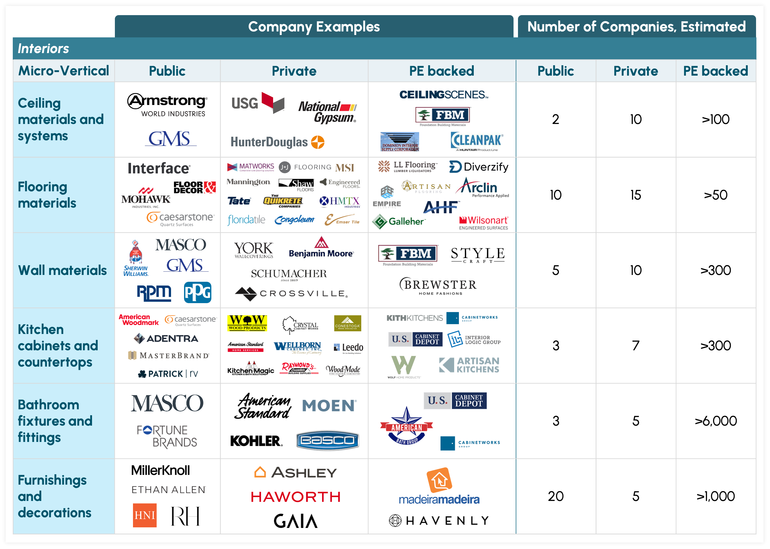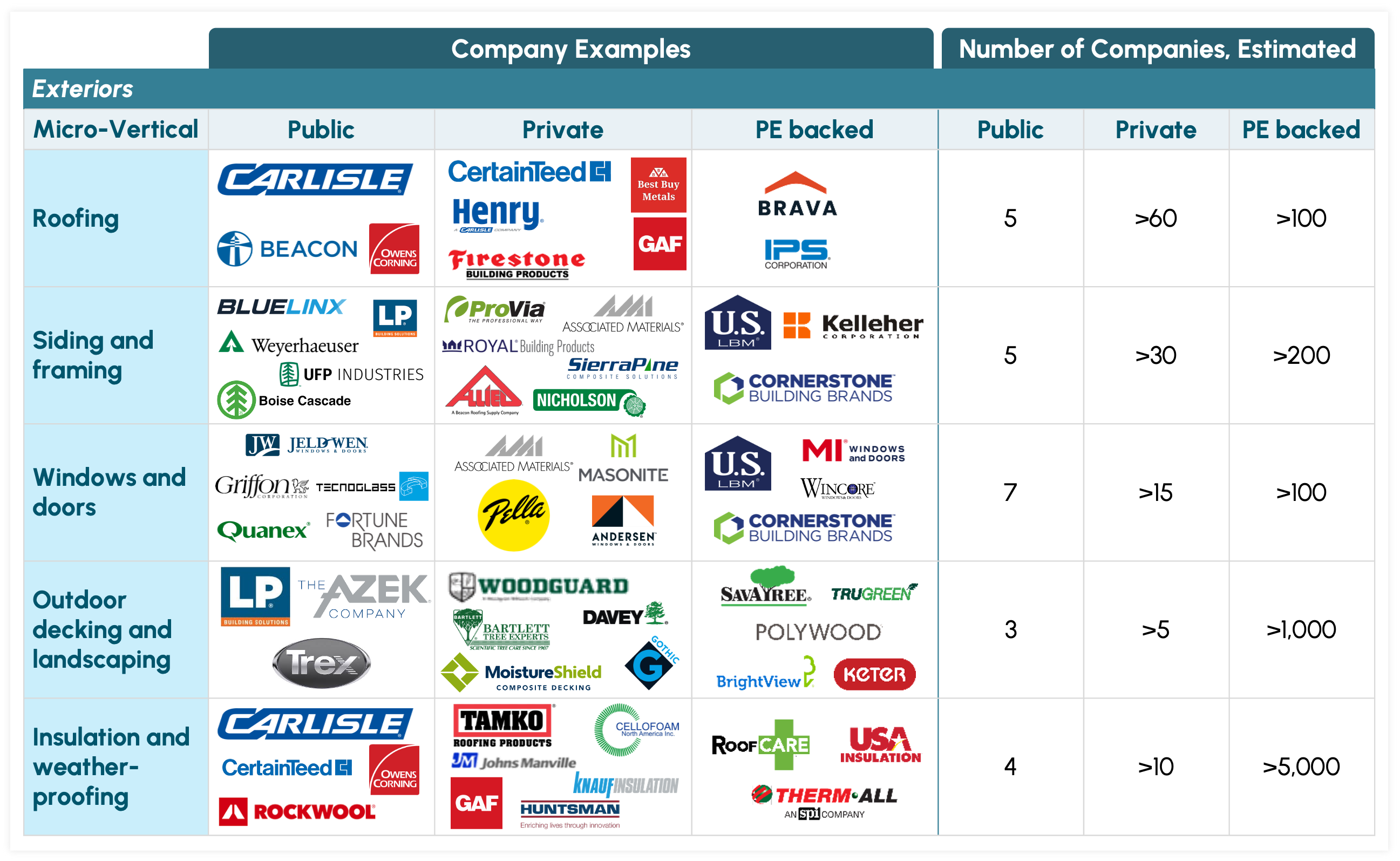 The building products industry is highly fragmented, with a large base of privately held companies in 12 micro-verticals: the 11 interior and exterior product categories listed in Table 1 plus a micro-vertical for other exterior products. More than 1,000 companies provide decking and landscaping, and more than 6,000 offer bathroom fittings.