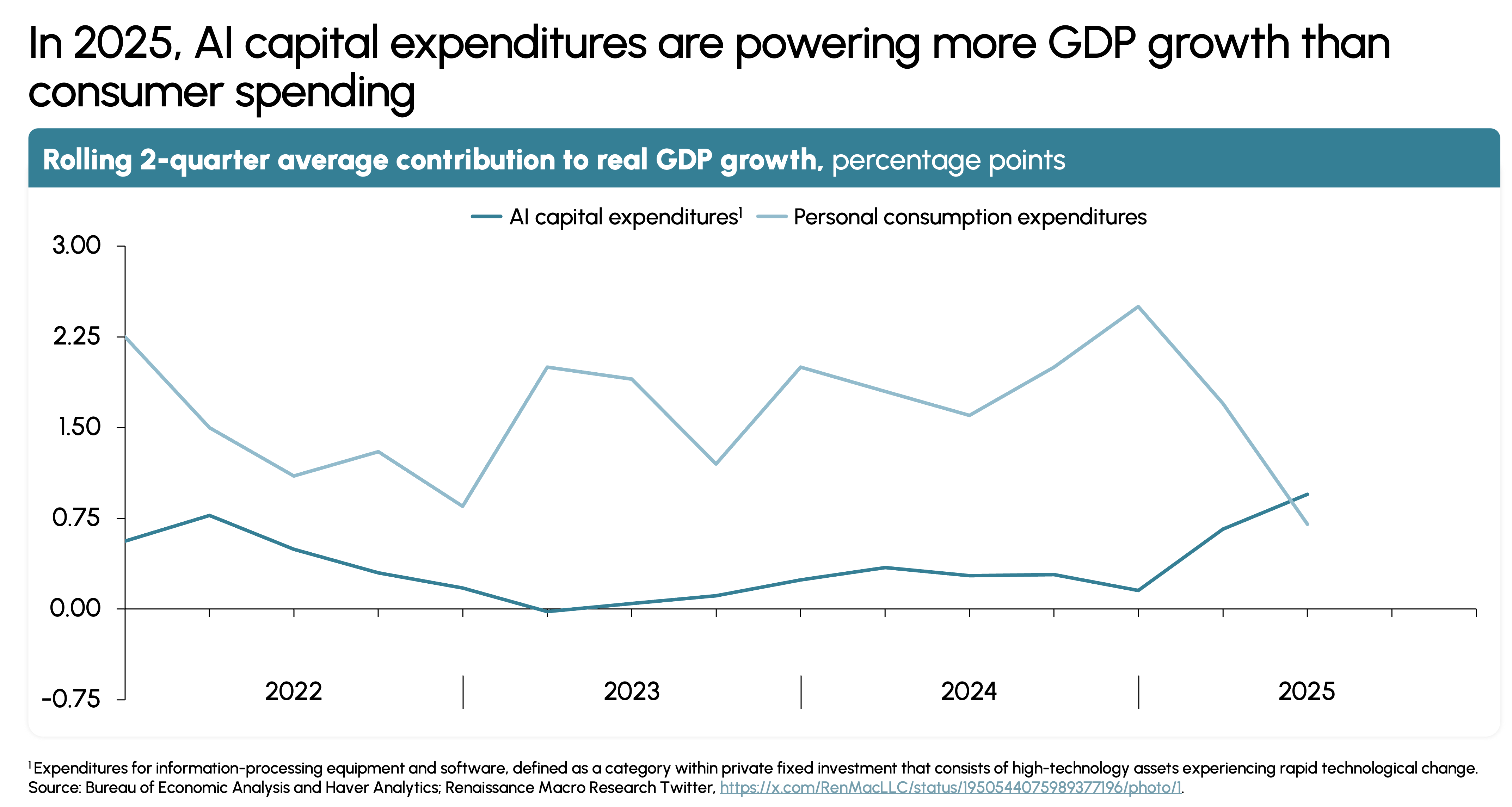 AI-related capital expenditures now contribute more to GDP growth than consumer spending (Exhibit 3). In 2025, AI CapEx accounted for 0.95% of GDP growth—surpassing personal consumption for the first time. The Mag 7 continue to capture the majority of value, delivering shareholder returns 4× higher than the broader NASDAQ.